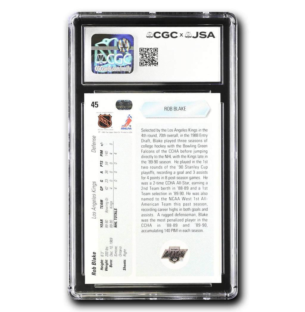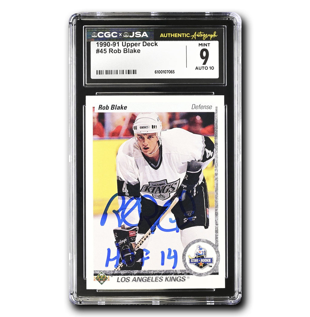 This is your chance to get your very own Rob Blake Autographed 1990-91 Upper Deck #45 Rookie HOF Inscribed (CGC 9/Auto 10)! This card is certified by James Spence Authentication (JSA) x CGC.