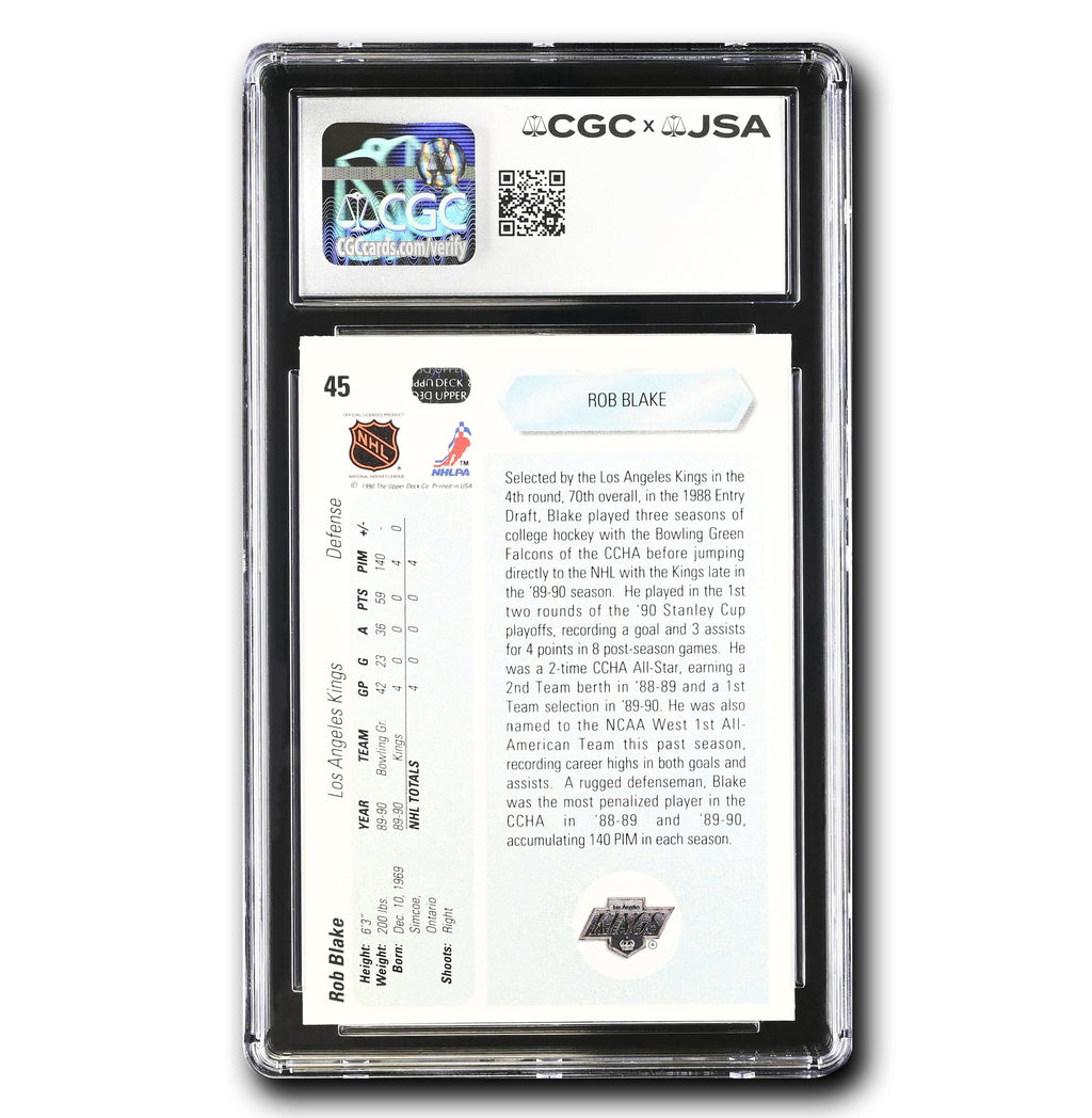 This is your chance to get your very own Rob Blake Autographed 1990-91 Upper Deck #45 Rookie HOF Inscribed (CGC Authentic/Auto 10)! This card is certified by James Spence Authentication (JSA) x CGC.